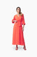 Vestido largo elegante rosado, cuello en V, ruedo regular, con bolsillos laterales y mangas tres cuarto.